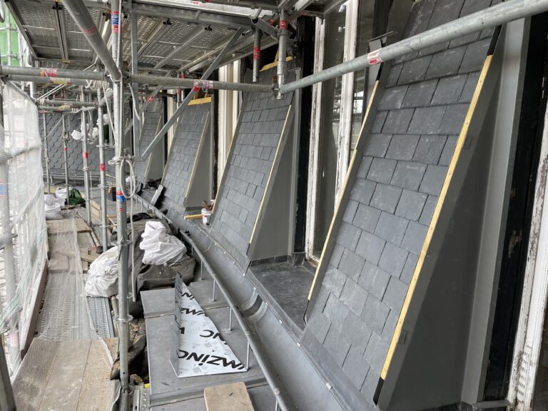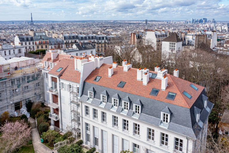Remplacement à neuf des couvertures en zinc avec ITE de versants rue, cour et brisis sur cour, avec augmentation de la pente du versant cour et ravalement des souches de cheminées