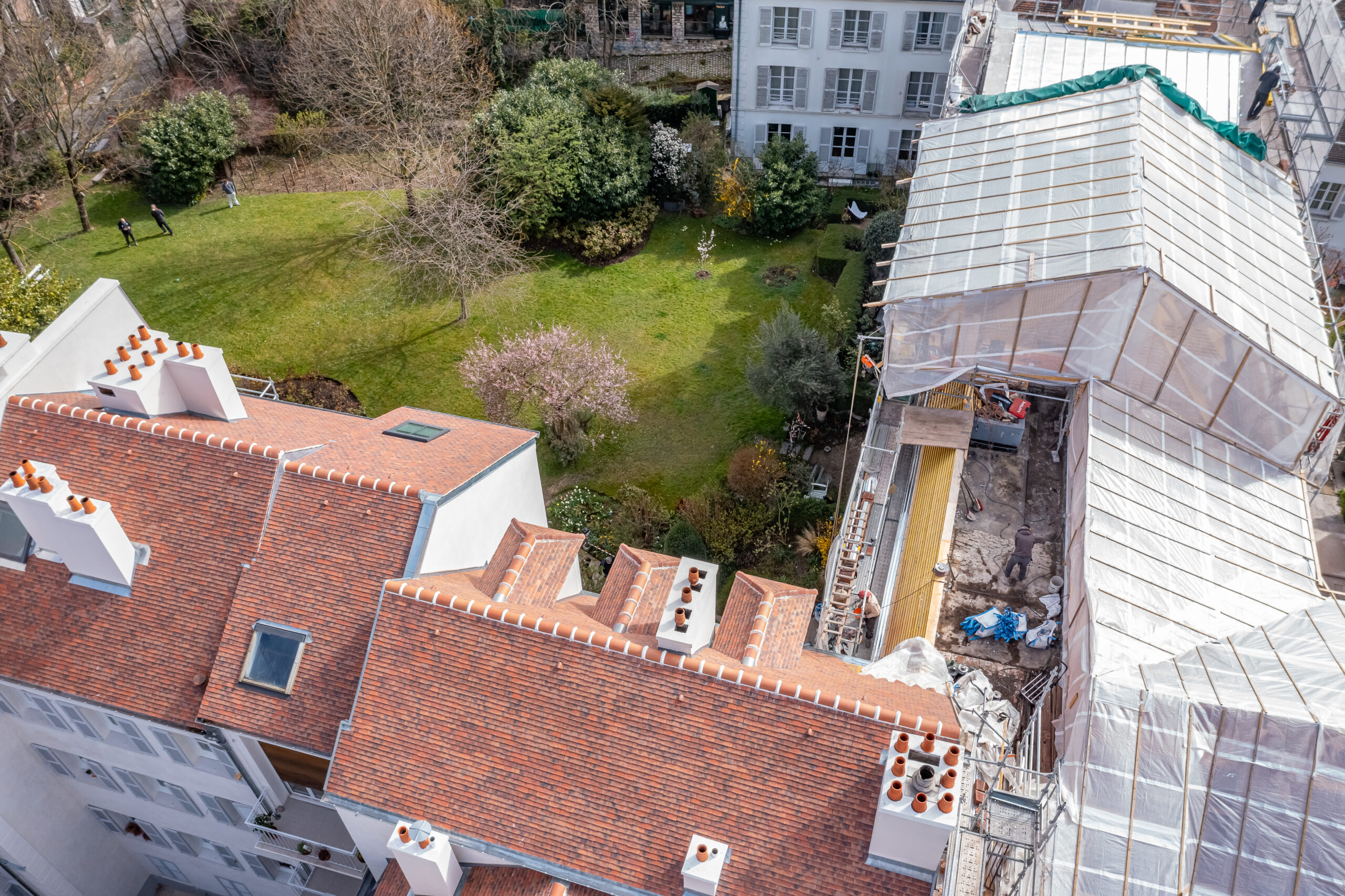 Réfection de la couverture de plusieurs bâtiments en tuiles plates sur terrasson et brisis ardoise sous parapluie